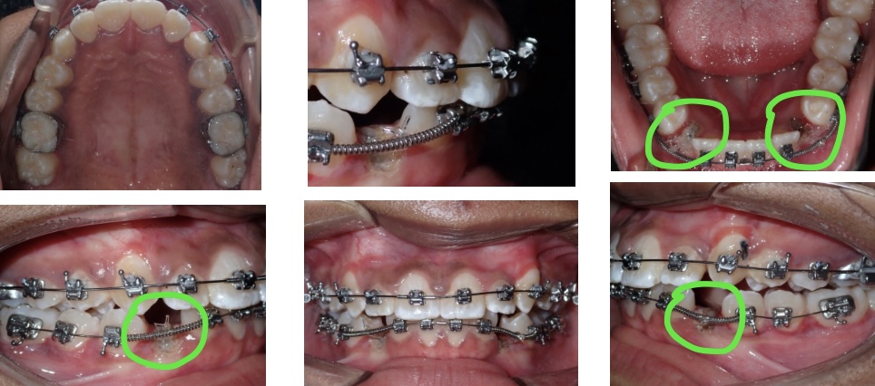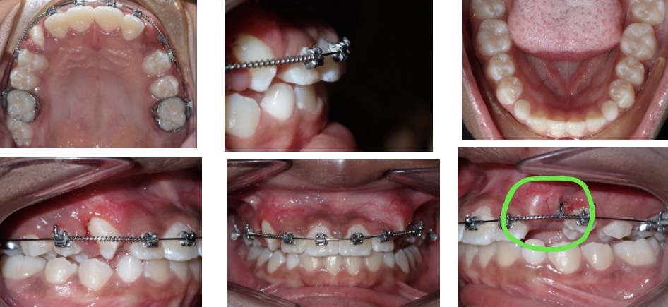 The Process. During this procedure, Lauren’s mouth was numbed. The periodontist or oral surgeon makes his/her way through the gum tissue and bone and glues a small button on the tooth. The button is then attached to a short gold chain. Back at the orthodontist office, we attach this chain to the wire of Lauren’s braces. Over a series of visits, we slowly pull the teeth closer and closer until we can finally see them poke through the gum tissue! Take a look at the highlighted areas below to see the areas where we slowly encouraged Lauren’s teeth to the correct positions.