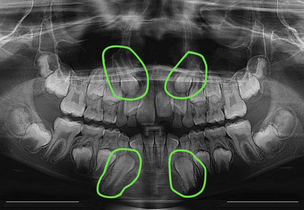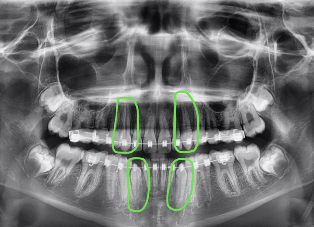 Patient. Lauren came to us a few years ago with the primary concern of "crowding." Upon taking an x-ray, we noticed all four of her canine teeth – which had not yet erupted – were positioned in such a way that they would likely harm her adjacent adult teeth. That’s not what we want! Thanks to the x-ray shown below, we knew that we needed to prepare Lauren’s mouth for the eventual eruption of those teeth!